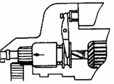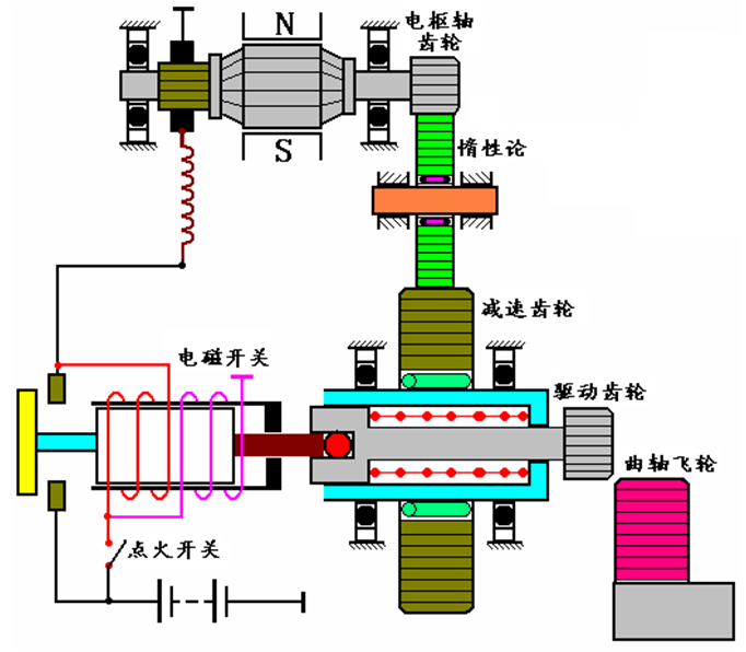 发动机起动后,飞轮带动驱动齿轮高速旋转,滚柱被带向腔室宽端,将驱动齿轮与电枢轴连系切断;