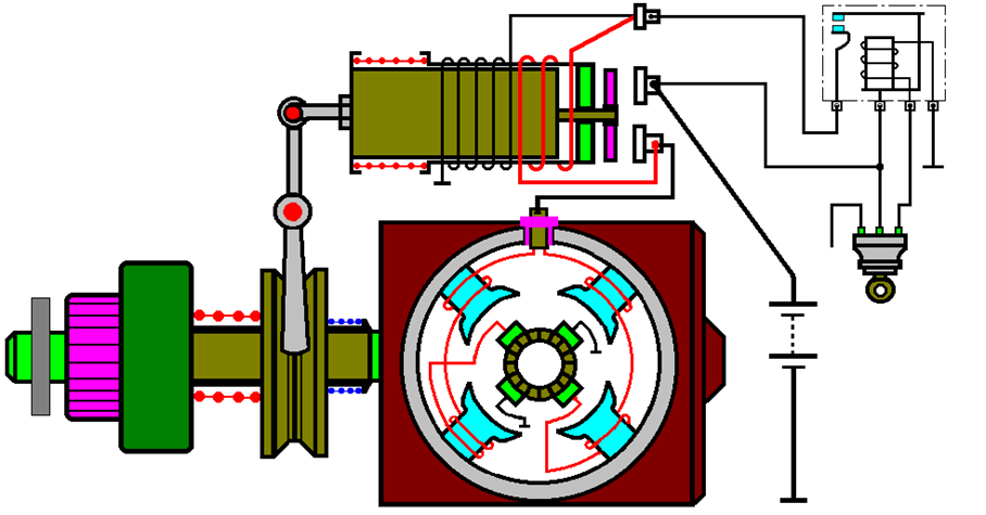 电刷架铆装在支撑板上,支撑板与外壳绝缘(夏利轿车)。