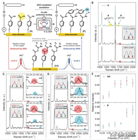1.以表面增强拉曼光谱(SERS)表征反应进行的程度。在酯水解反应中,以1706cm-1处的C=O振动峰强度作为指标,并以1070cm-1处的芳香环C-C振动峰强度作为内标,施加相对于开路电压正或负的电压,研究反应进行的情况。