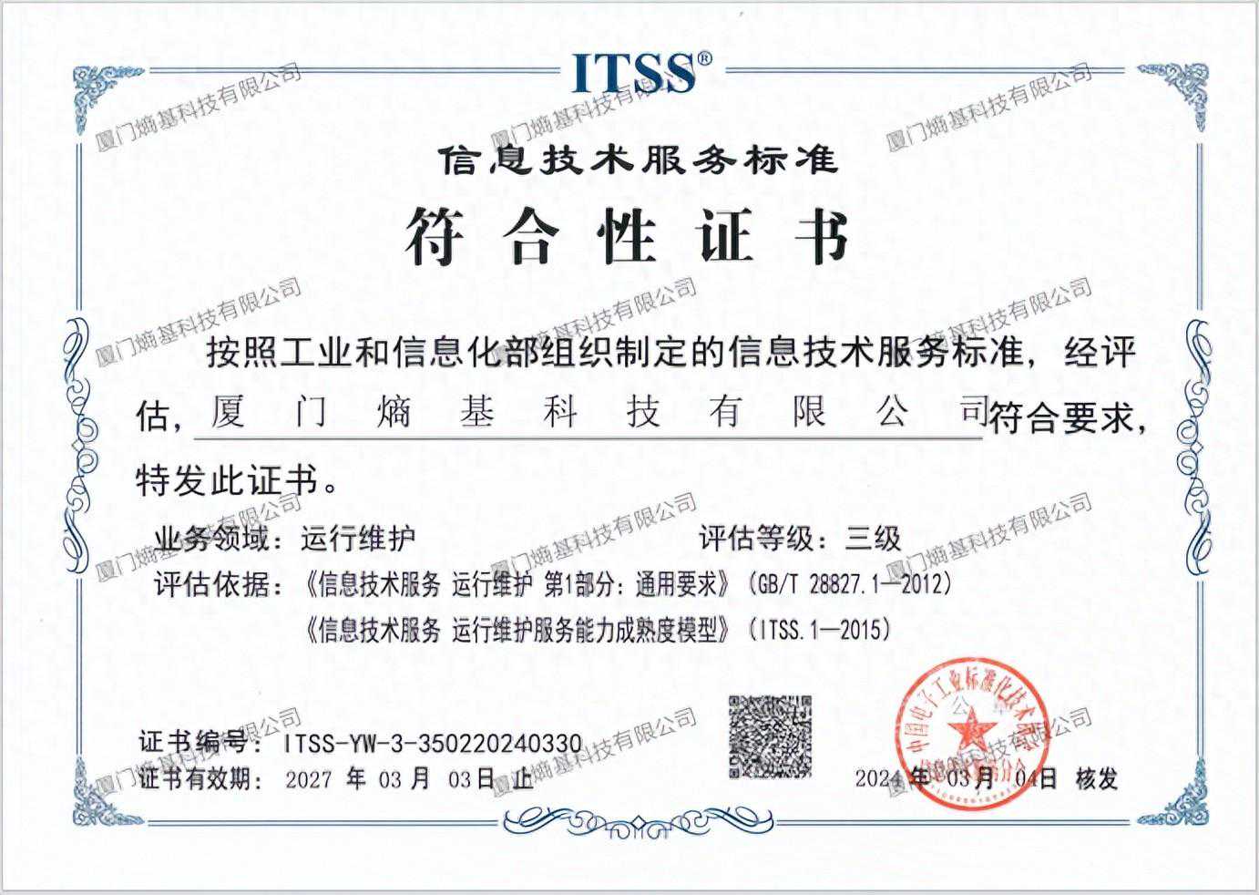 据悉,ITSS(InformationTechnologyServiceStandards,信息技术服务标准,以下简称“ITSS”),被认为是国内信息技术行业重要的评估准则,是在工业和信息化部、国家标准化委领导和支持下,由中国电子工业标准化技术协会信息技术服务分会研制。其中,ITSS3级运维资质是最受金融与保险机构、互联网企业、电信运营商欢迎的资质认证之一。