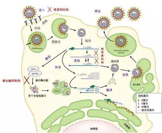 冠状病毒生命周期以及药物作用靶点