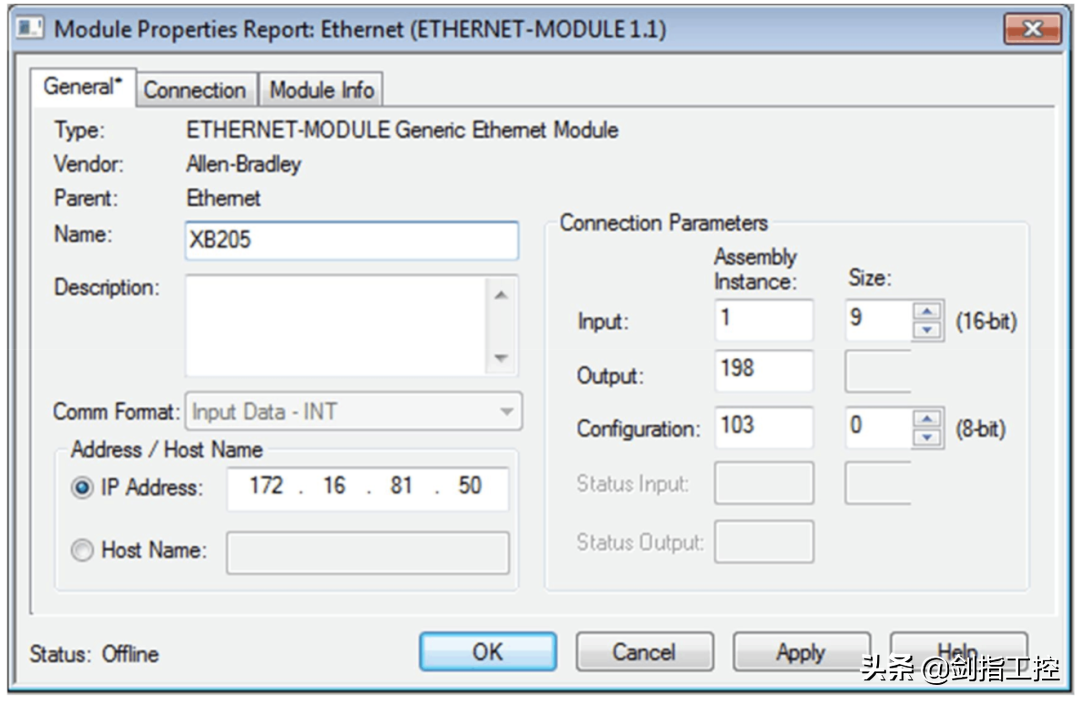 导入AOI之前需要在RSLogix5000中配置SCALANCE通讯模块,首先,在I/O配置中创建一个通用以太网模块,分配这个XB200模块的IP地址和参数,RPI的时间要大于20ms。