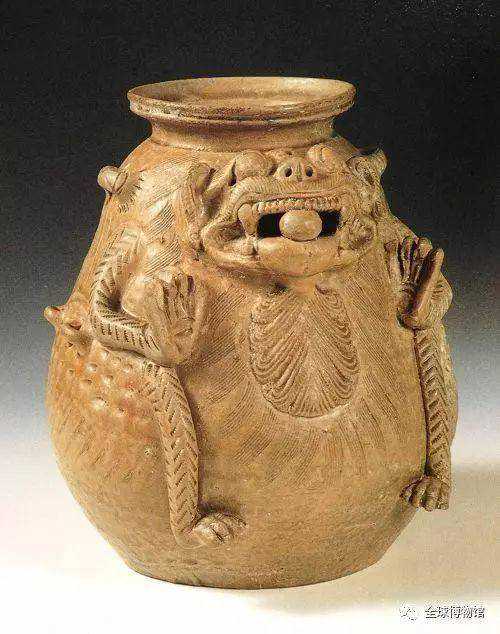西晋青瓷神兽尊在1976年出土于宜兴周处家族墓周墓墩中。神兽尊造型略微呈梨式,肩部两侧和腹部各有三只横系,上大下小,作品字形排列,平底微内凹。此青瓷神兽尊体量大,神兽的神态惊人,全身刻满纹饰,造型独特而又具有西晋瓷器的典型特征,是我国最早有铭款的瓷器之一。