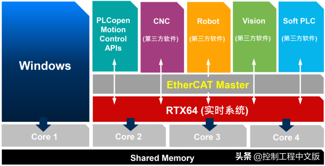 只需一台工业PC,装上一个带Windows实时扩展系统的软件,就可以用纯软件的方式替代控制器里原本的专属硬件,打造一个集PLC控制、运动控制和视觉控制等于一体的高级控制器。这种所谓的纯软件实时控制凭借其众多独特优势,受到了自动化控制领域的青睐,特别是在当前工业4.0时代万物互联趋势之下,纯软件实时控制相较于PLC和PAC,具有更有优势的控制架构,成为越来越多机器自动化用户的新选择。