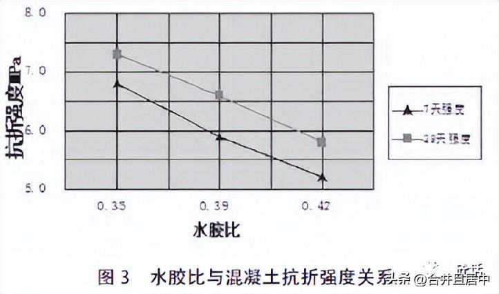 为了保证混凝土抗折强度尽可能降低配合比水胶比,但是水胶比过小又会造成混凝土塌落度小、和易性差,增加施工难度,甚至影响混凝土密实度和抗折强度,同时过小的水胶比会使得水泥用量提高,混凝土易产生收缩裂缝和温度裂缝,同样影响混凝土抗折强度。依据《公路水泥混凝土路面施工技术规范》要求,最大单位水泥用量不宜大于400kg。