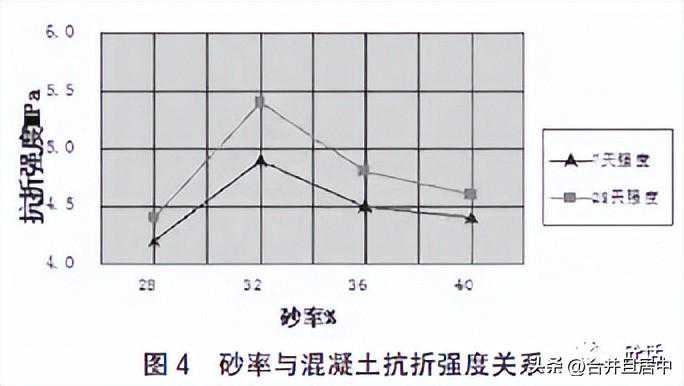 混凝土配合比的砂率对其工作性能有较大影响,混凝土抗折强度会随着砂率的增大而出现先增后减的趋势,如图4所示。
