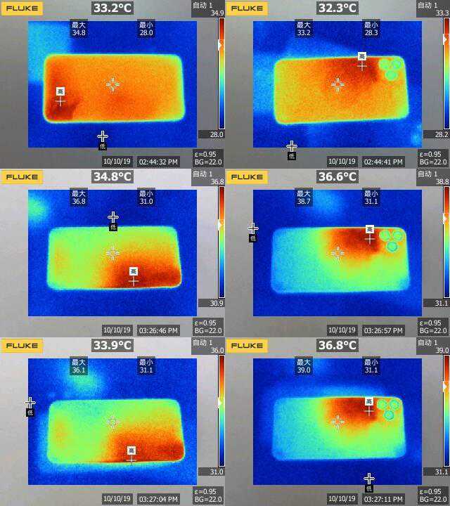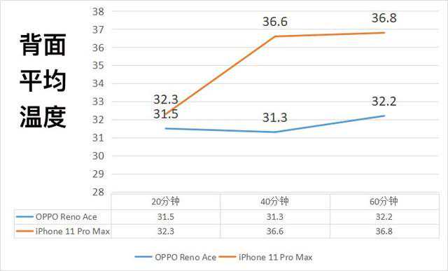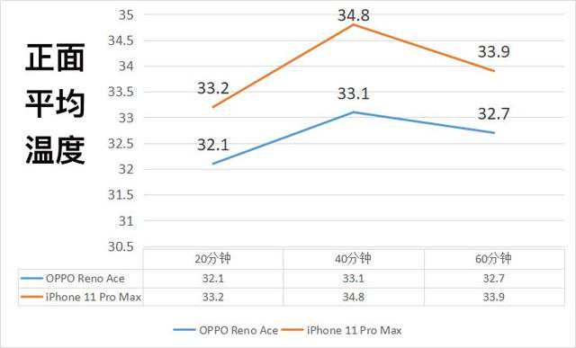 对数据进行整理后,OPPORenoAce的正面平均温度为32.6℃,iPhone11ProMax的正面平均温度为33.9℃,两者的正面平均温度实际上相差不大。OPPORenoAce的背面平均温度为31.6℃,iPhone11ProMax的背面平均温度为35.2℃,背部平均温差为3.6℃,散热效果高下立判。看来OPPO这次在散热技术上还是投入了不小的研发力量,OPPORenoAce的散热效果的确是非常出众的。