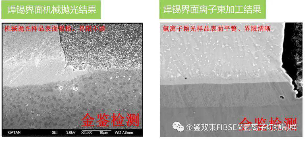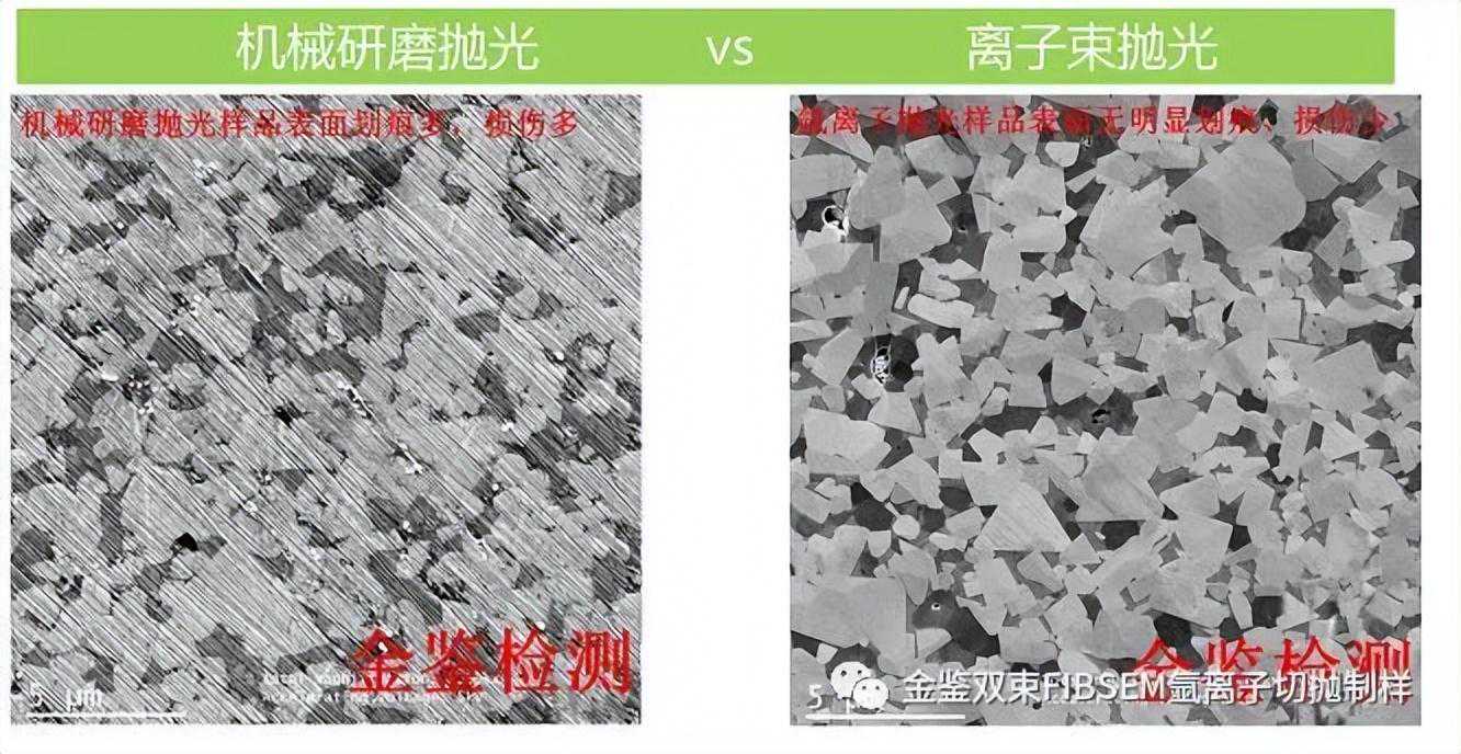 由于氩离子抛光技术是利用氩离子束对样品进行抛光,氩离子束作用精准而柔和,因此可以获得表面平整光滑、划痕损伤少、界限清晰的样品。而机械研磨抛光制备出来的样品表面粗糙不平、坑坑洼洼、划痕损伤多、界限不清。