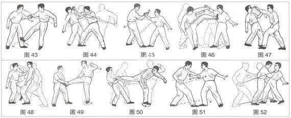 设吾与敌交手之际,见敌有隙可乘,即上步起右腿挑敌下阴,不料敌虚中有实,一不留神,右腿反被敌擒住(图49)。