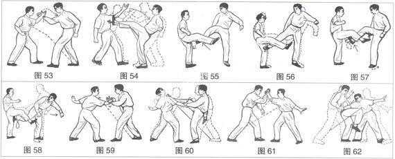 承上式,右手一将敌之右腕抓住,同时左手向上掳住其右肘部,施劲向我右后方拉挫。同时配合双手之拉劲,施撞诀之斜劲,劲贯右膝头,对准敌之心窝撞去,敌必大创(图62)。