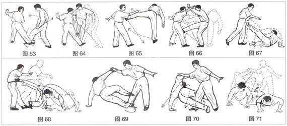 设吾与敌交手之际,敌突然止步,一拳当胸击来,势急而不及闪避,即施腰劲,身向后翻左侧跌下,以左肘左肩着地支持重心,同时配合身向后翻仰之势,左腿向敌右腿前伸,右腿向敌右腿后伸,迎力将敌胯部夹紧(图70)。