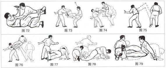 设吾与敌交手之际,敌突然上步当胸一拳击来,吾不及还手,急以右手抓住敌之左腕(抓不住亦可),同时用腰劲一挺。身向后翻仰,以双肘或单肘支持着地,双腿往上前冲,如老树盘根式,迎面将敌肋骨以下之软腰夹住,双脚互相勾挂。施夹剪诀之横劲,迎合双胫互相勾别之劲,用双膝往里迎力夹剪敌人之腰部,而往下坠使敌跪地,此时可乘机以背臀着地,双手防敌之双手,待敌喊痛求饶为止(图72)。