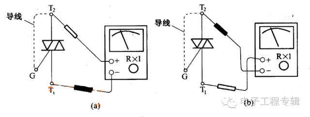 再将正表笔接T1极,负表笔接T2极,所测电阻也应为无穷大,然后用导线将T2极与G极短接,相当于给G极加上正触发信号,此时所测T1-T2极间电阻应为10Ω左右,如图(b)所示。若断开T2极与G极间的短接导线阻值不变,则说明管子经触发后,在T2→T1方向上也能维持导通状态,且具有双向触发性能。上述试验也证明极性的假定是正确的,否则是假定与实际不符,需重新作出假定,重复上述测量过程。
