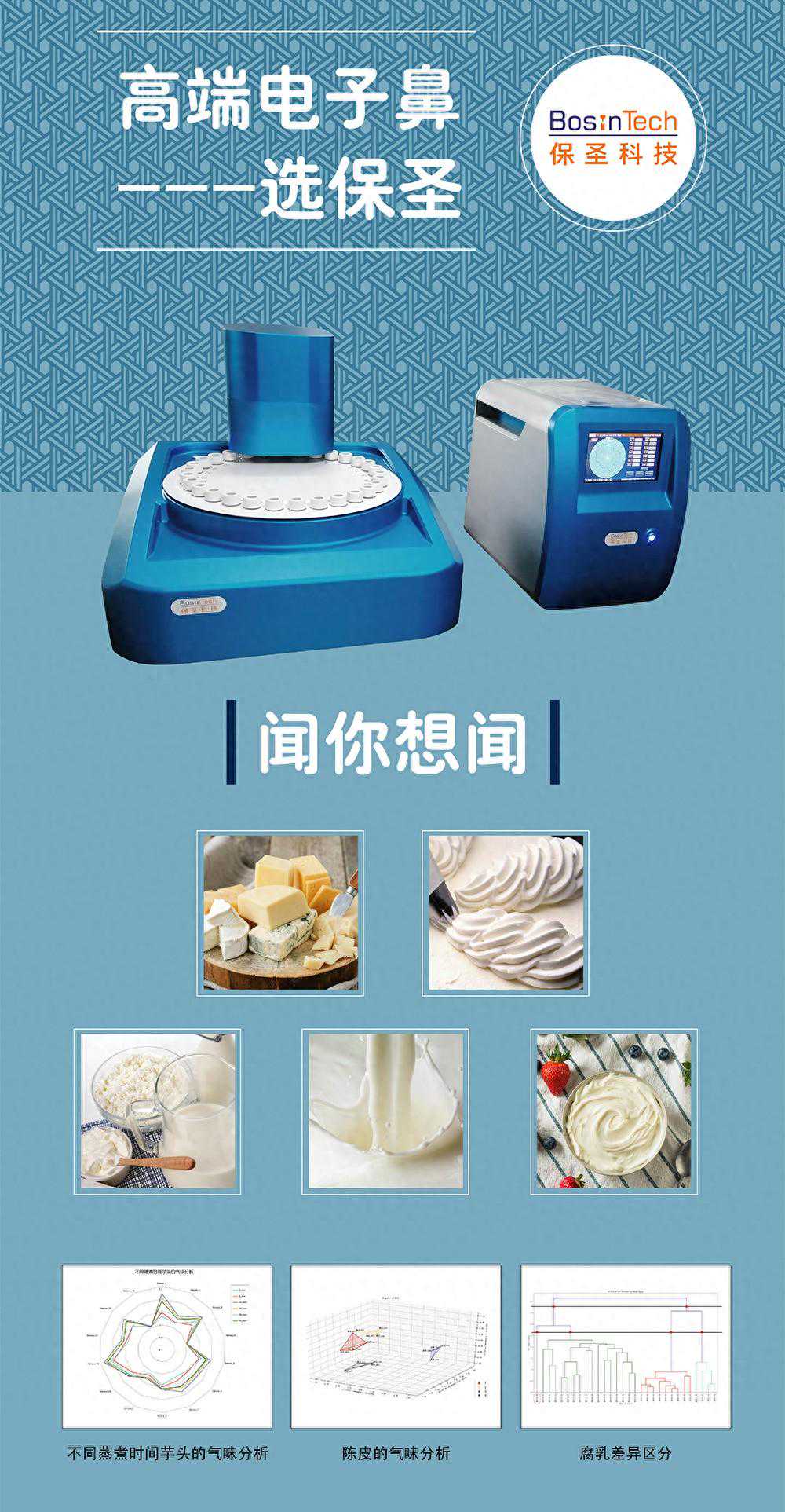 上海保圣CNose电子鼻的检测对象主要针对挥发性的风味物质。当一种或多种风味物质经过电子鼻时,该风味物质的“气味指纹”可以被传感器感知并经过特殊的智能模式识别算法提取。利用不同风味物质的不同“气味指纹”信息,就可以来区分、辨识不同的气体样本。另外,某些特定的风味物质恰好可以表征样品在不同的原料产地、不同的收获时间、不同的加工条件、不同存放环境等多变量影响下的综合质量信息。电子鼻采用先进的传感器组合而成,是目前同类仪器稳定性好,检测精度高的电子鼻。非常适用于检测含有挥发性物质的液体、固体样品。