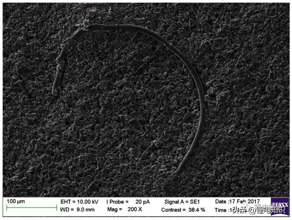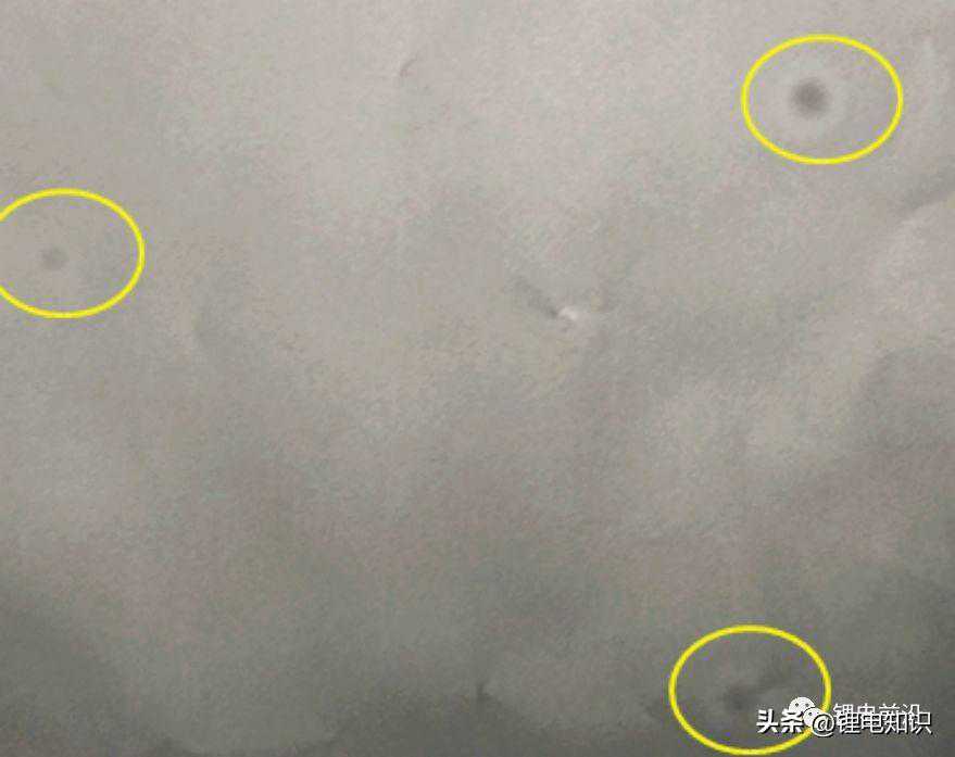 从图4可以看出,与正常区域相比,化成后气泡中心是白色,说明此处发生析锂,周围有一圈暗灰色过渡,说明此处碳层较厚,锂离子未完全嵌入,刚好与图1对应。原理是:电池充放电时发生电泳反应,当正极片对面的负极部位容量不足时,充电时所产生的部分或全部的锂就无法插入负极石墨的间层结构中,会在负极片表面析出,形成突起状枝晶,而下一次充电时,这个突起部分更容易造成锂的析出,经过几十至上百次的循环充放电后,枝晶会长大,最后会刺穿隔膜,使内部产生短路,导致安全事故发生。因此应尽量杜绝涂布表面气泡的产生。