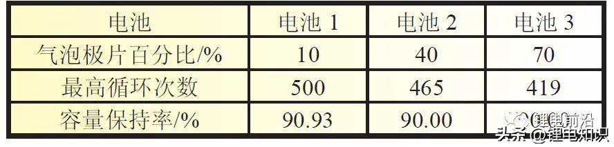 将气泡极片制成3只电池,在常温下进行500次循环性能实验,当电池容量保持率低于90%时实验自动终止。3只电池使用的负极气泡极片比例占电池总负极片的比例分别为10%、40%、70%,电池的循环结果见图3,实验结果见表1。