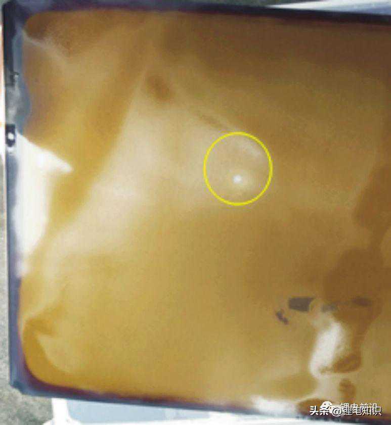 将上述3只电池在满电状态下解剖,气泡处外观如图4所示。