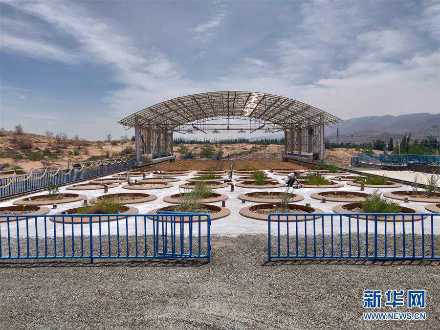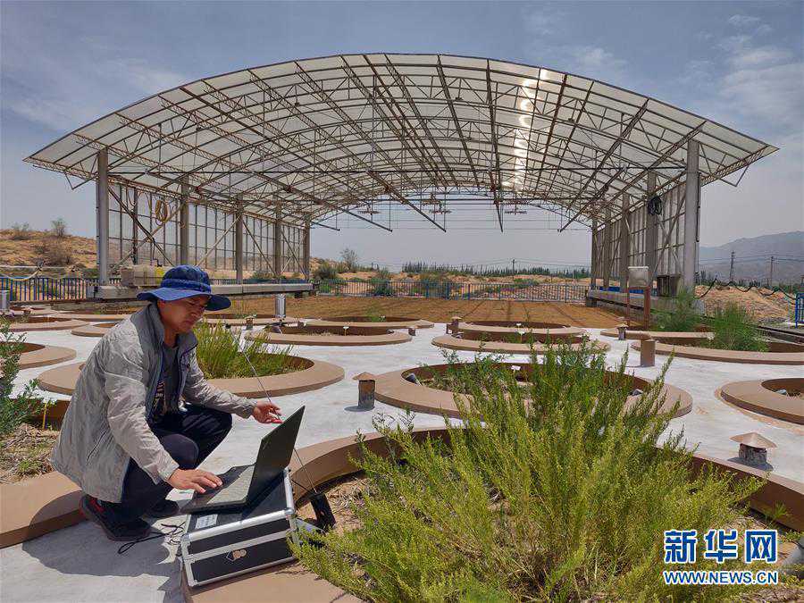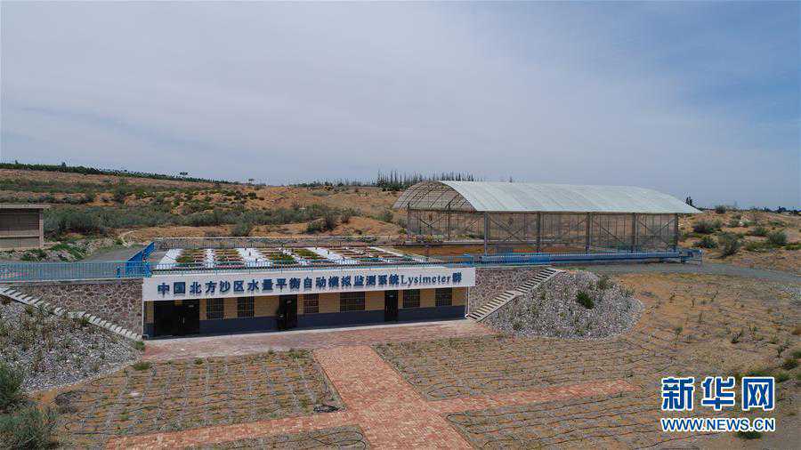 7月3日拍摄的中国北方沙区水量平衡自动模拟监测系统—蒸渗仪群。新华社发(杨昊天摄)