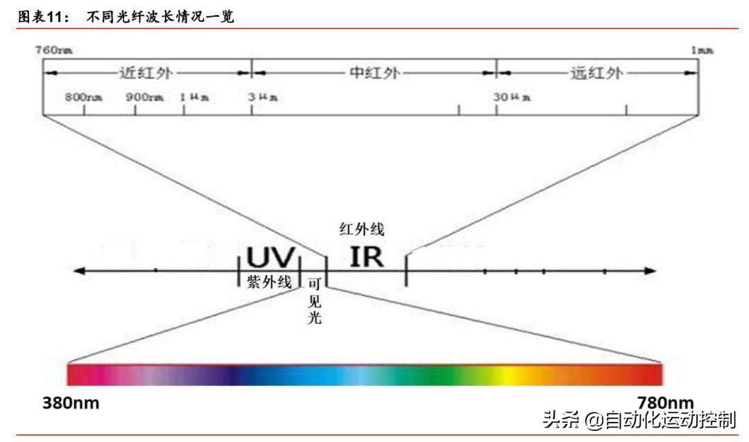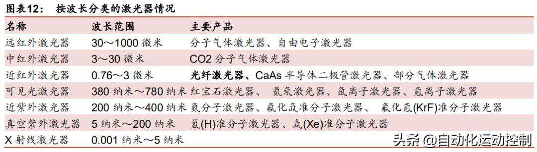 光纤激光器直接输出的激光多为波长在960μm之间的近红外光。激光器大类按照波长由短到长的顺序涵盖了从X射线到远红外的各类激光器,波长从0.001纳米到1000微米不等。其中光纤激光器直接输出的激光主要在近红外部分。但为了实现不同应用需要,光纤激光器通过倍频可以输出可见光,主要应用是绿光;通过在光纤中掺氟化物可以输出中红外光。