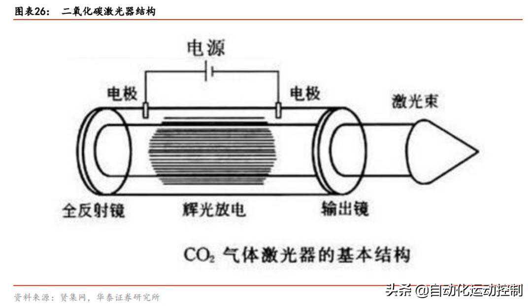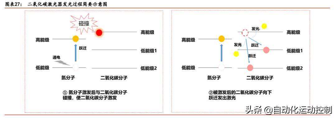 实现粒子数反转是二氧化碳激光器发光的关键。二氧化碳激光器中工作物质包括二氧化碳、氮气和氦气,输入直流电源后混合气体中的氮分子会受到电子撞击从而被激发,收到激发后的氮分子与二氧化碳分子碰撞时会将能量传递给二氧化碳分子,从而使得二氧化碳分子从低能级跃迁到高能级上形成粒子数反转发出激光。