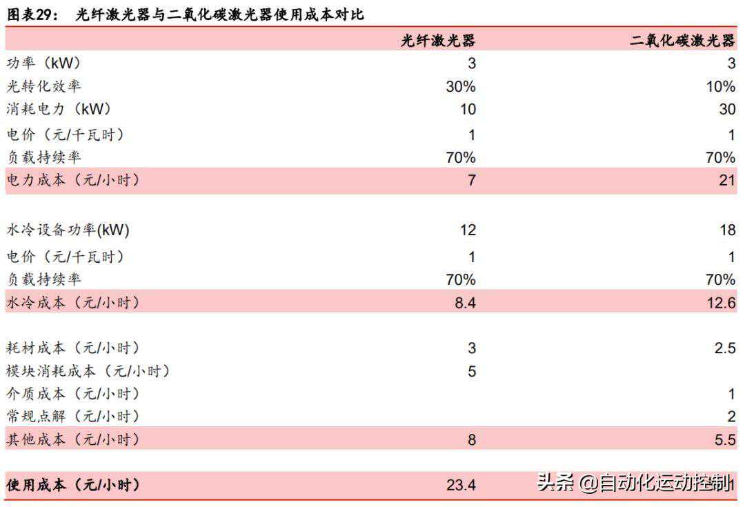 光纤激光器光转化效率更高,使用成本较低。根据测算可得,光纤激光器的使用成本为23.4元/小时,二氧化碳激光器的使用成本为39.1元/小时,其中,光纤激光器电力成本为7元/小时,水冷成本为8.4元/小时,其他成本为8元/小时;二氧化碳激光器电力成本为21元/小时,水冷成本为12.6元/小时,其他成本为5.5元/小时。