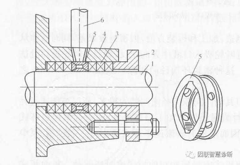1——轴;2——压盖;3——填料;4——填料箱;5——液封环;6——引液管