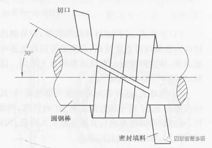 (1)切割密封填料时,宜将密封填料绕在和主轴同样直径的圆钢棒上切割,以保证尺寸正确,切口平行,如图2所示。密封填料的接口宜切成30°~45°的割口,切口应齐整,无松散的石棉线头。