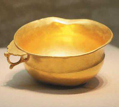 青海都兰热水墓群2018血渭一号墓出土的唐代鋬指金杯。杜建坡摄