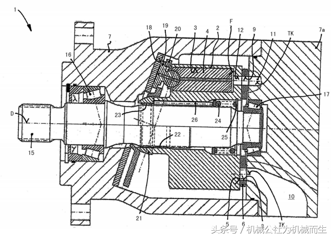 缸筒2被一个中央孔透穿,与旋转轴线D同轴地布置的驱动轴15通过所述中央穿过所述缸筒2。驱动轴15借助支承装置16,17可旋转地支承在壳体7中。缸筒2例如借助缸筒2的缸筒颈部区域中的齿部22与驱动轴15旋转同步地、然而能轴向移动地连接,所述区域成形在缸筒2上并且沿轴向方向朝行程盘18的方向延伸。