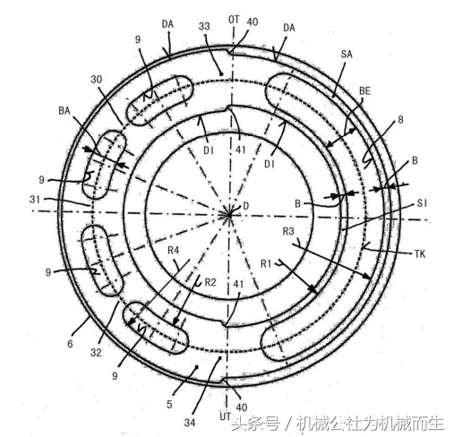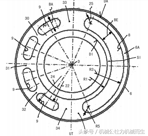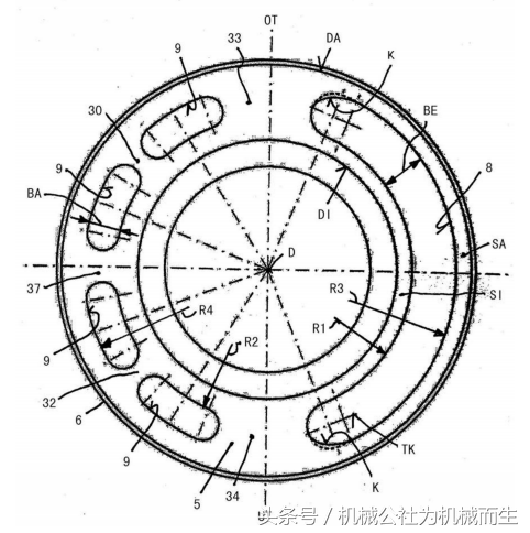 在图中以纵截面图示出现有技术中的斜盘实施方式的静压轴向活塞机1,轴向活塞机以开放的循环回路运行并且在泵运行方面被优化。轴向活塞机1具有能绕着旋转轴线D旋转地布置的缸筒2,缸筒配有多个与旋转轴线D同轴地布置的、布置在部分圆TK上的活塞空槽3,活塞空槽优选地由圆柱形孔构成并且各一个传动装置活塞4能纵向移动地支承在圆柱形孔中。