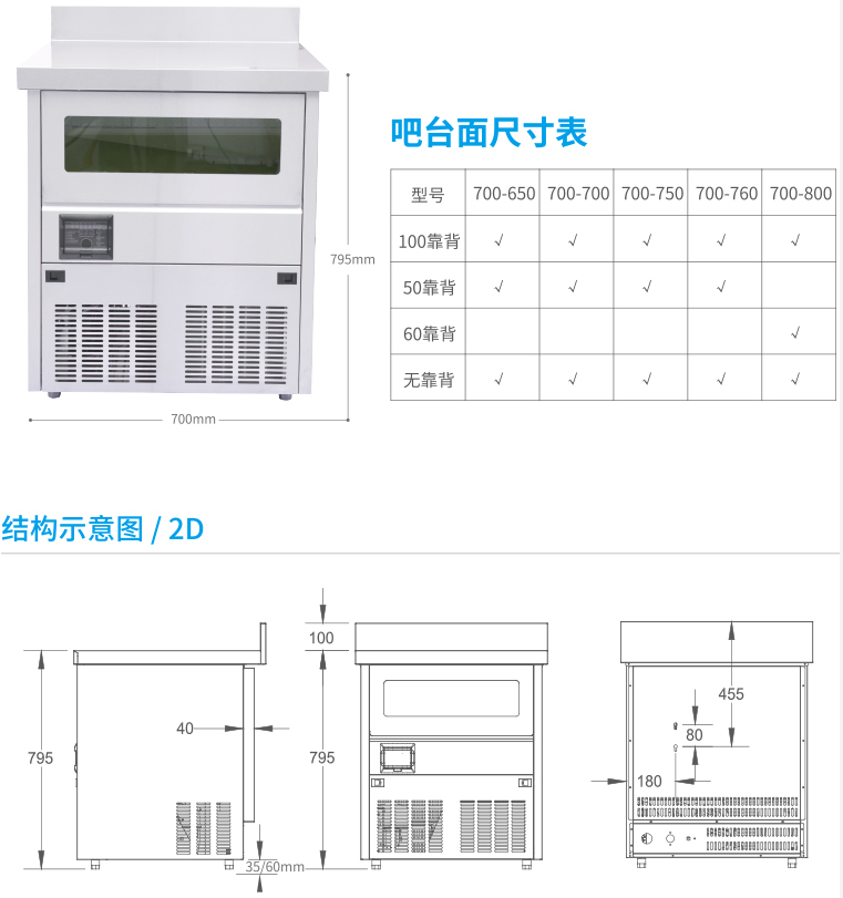 除此之外,这类合二为一的整体化工作台面最大特色是:外形美观、高端,使用门店空間小,超省空間!这类吧台制冰机的产冰量在60-120KG/24h,冰桶的储冰量有20-40KG,依照50KG能符合100接待量上下的人流量的算法来测算,这类吧台制冰机能符合的人流量是100-200接待量上下。如果开店选址位置旺,人流量高于这一范围的话,就须要购买其他型号制冰机。