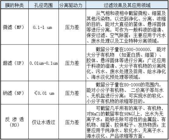 ①依据孔径的不同(或称为截留分子量的大小),可将膜分为微滤膜、超滤膜、纳滤膜和反渗透膜。