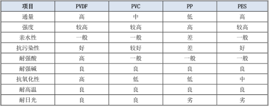 目前大型水资源化解决方案中使用较多的为PVDF、PES,其中PVDF由于其优良的物理化学性能被认为是目前制作超、微滤膜最好的膜材料,使用量大,尤其在污水处理与回用过程中应用广泛,几类主要有机膜材质性能比较如下: