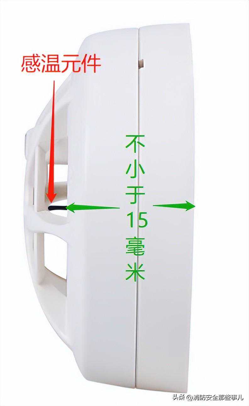 明确规定:探测器的感温元件(辅助功能的元件除外)与探测器安装表面的距离不应小于15mm。这个距离是为了防止安装墙高温度干扰,只探测空间温度,避免误报。例如:钢架结构房间在烈日照射下温度较高,可能误报。