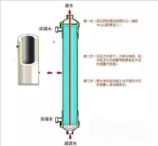 超滤过滤是一种膜分离过程,超滤利用一种压力活性膜,在外界推动力(压力)作用下截留水中胶体、颗粒和分子量相对较高的物质,而水和小的溶质颗粒透过膜的分离过程。通过膜表面的微孔筛选可截留分子量为3x10000—1x10000的物质。当被处理水借助于外界压力的作用以一定的流速通过膜表面时,水分子和分子量小于300—500的溶质透过膜,而大于膜孔的微粒、大分子等由于筛分作用被截留,从而使水得到净化。也就是说,当水通过超滤膜后,可将水中含有的大部分胶体硅除去,同时可去除大量的有机物等。