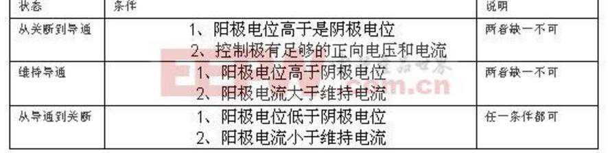 通过上面对工作原理的分析可知,可控硅只具有导通和关断两种工作状态,那么这两种工作状态之间如何进行转换呢?如下表: