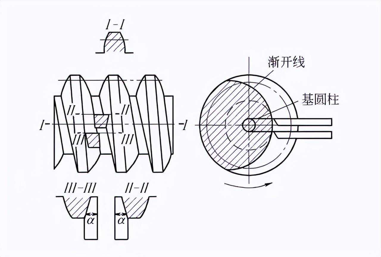 渐开线蜗杆(ZI型)——刀刃平面与蜗杆基圆柱相切,端面齿为渐开线,适于较高速度和较大的功率。