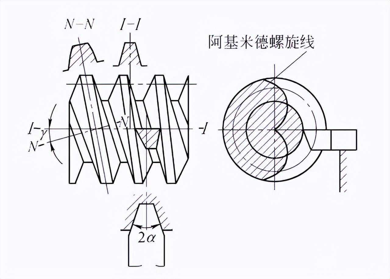 阿基米德蜗杆(ZA型)——垂直于轴线平面的齿廓为阿基米德螺线,过轴线的平面内齿廓为直线,加工简单,精度较低。(轴向直廓蜗杆)。