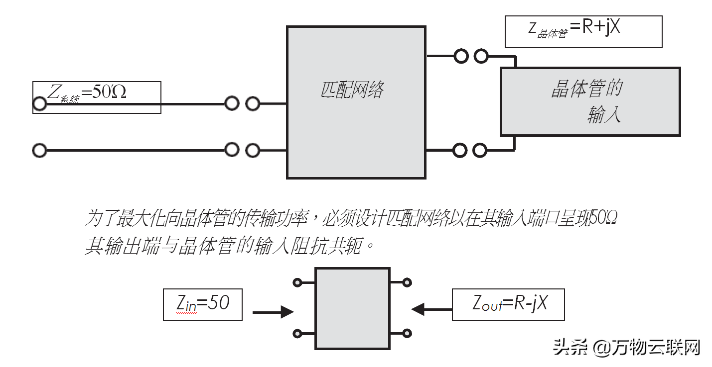 图1、使用匹配网络将晶体管输入阻抗共轭匹配到50Ώ