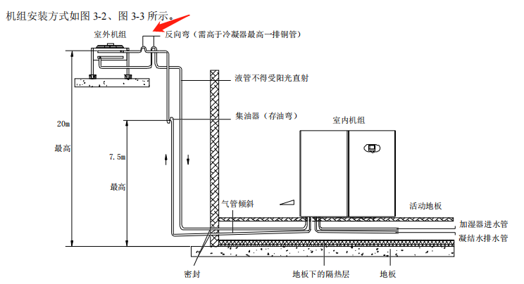 如图:室外机安装需设置反向弯