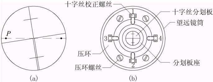 校正:卸下十字丝分划板护罩,松开4个压环螺丝,缓慢转动十字丝组,直到照准部水平微动时,P点始终在横丝上移动为止,最后旋紧四个压环螺丝。
