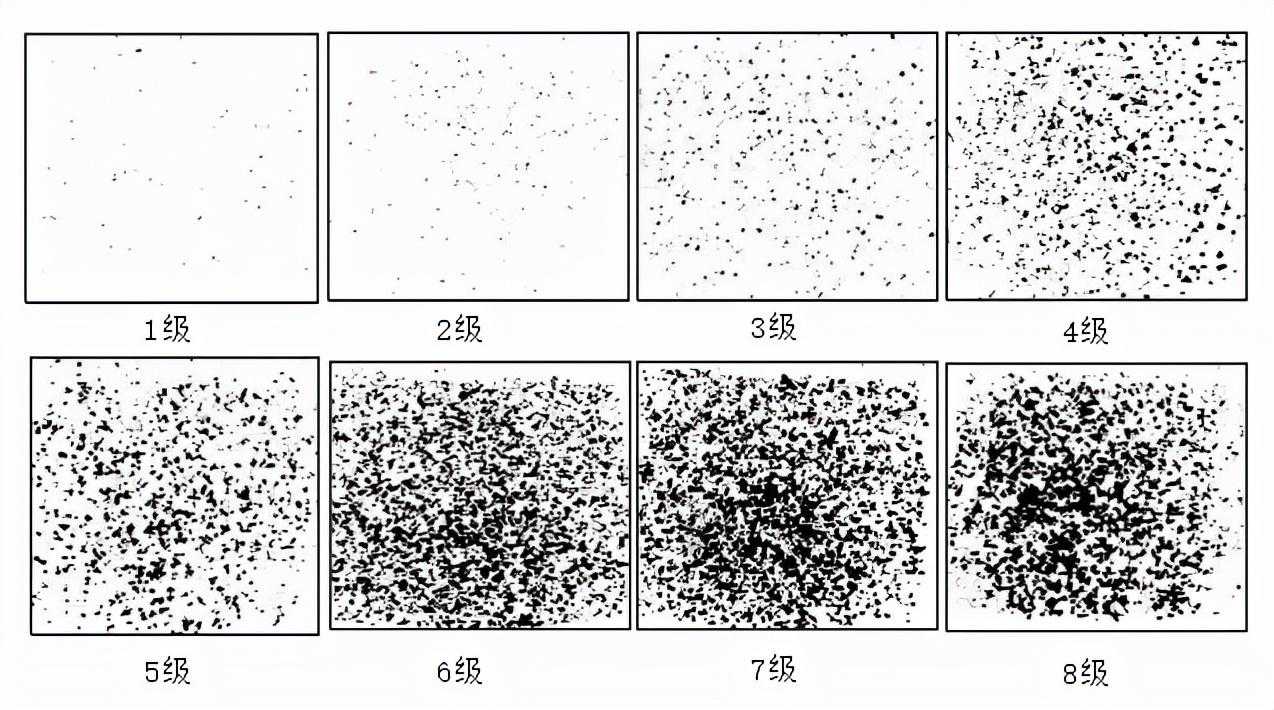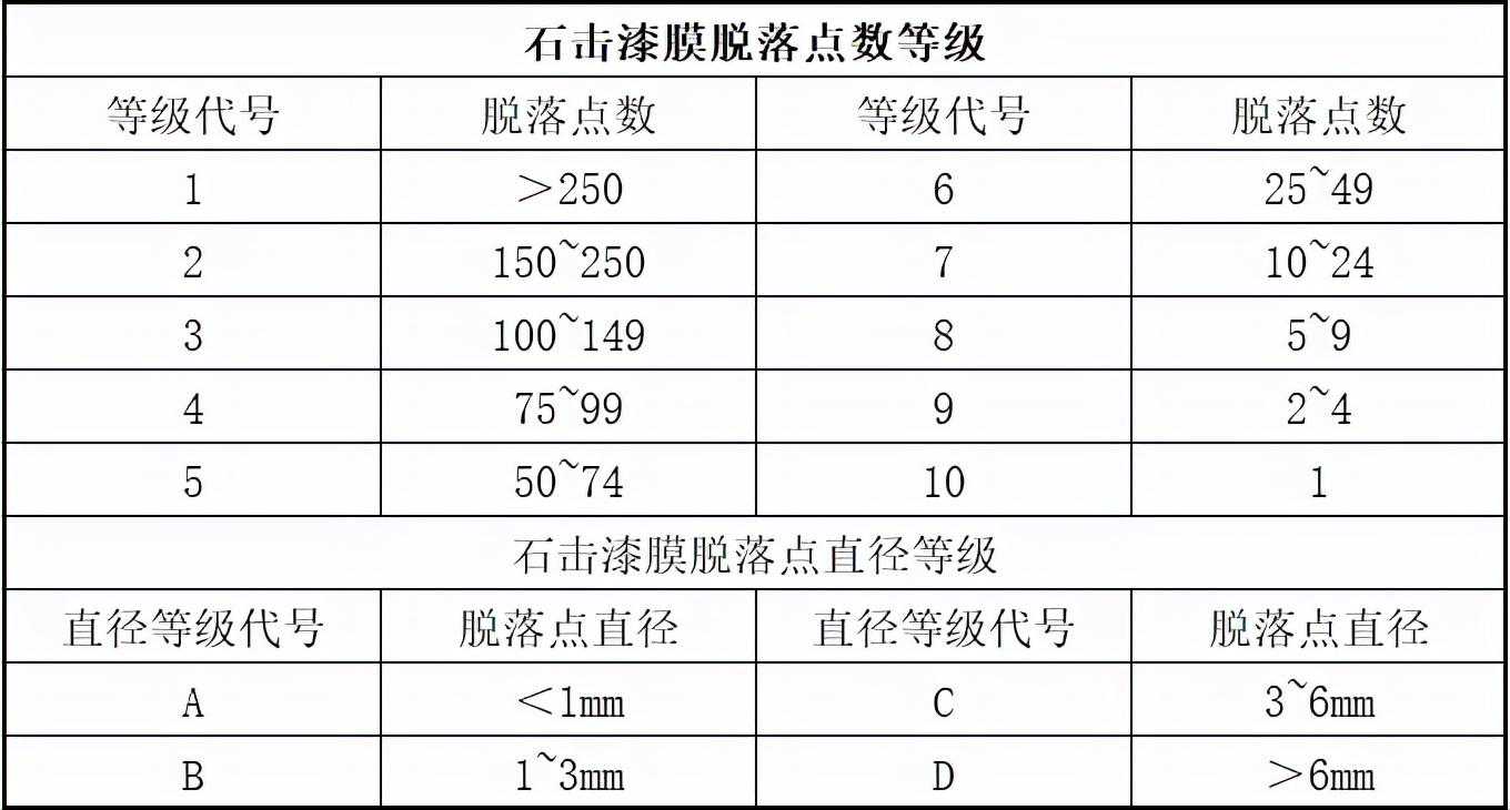 将试样表面涂层的破损、脱落情况与标准特征类型(石击等级识别图)比较、分析,以判定该涂层的抗石击性能。(参考下图)