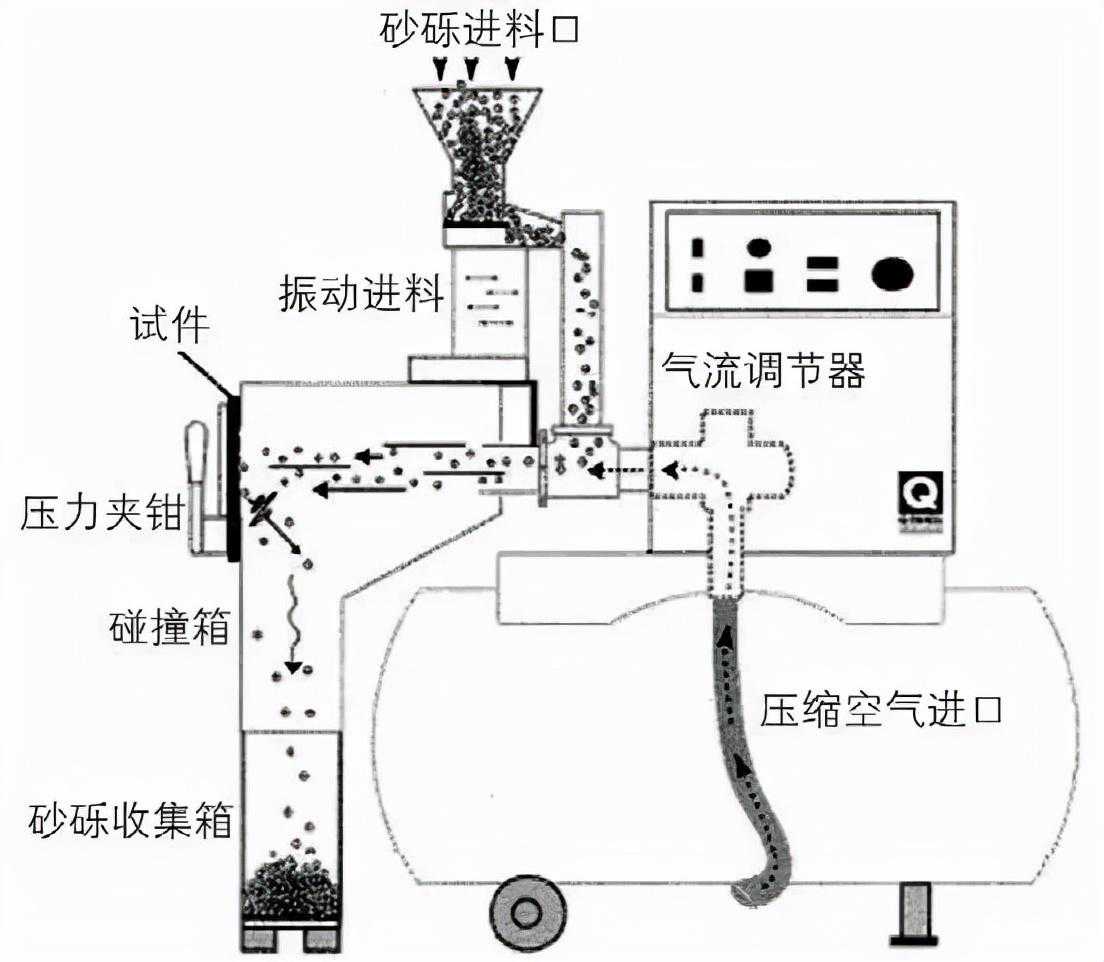 碎石冲击测试的思路是使用上海久滨生产的碎石冲击仪,用一定的压强喷射铁砂、鹅卵石等测试体冲击测试样板,通过评价样板受损的情况,以此评定零部件在实际使用中的抗碎石冲击能力。