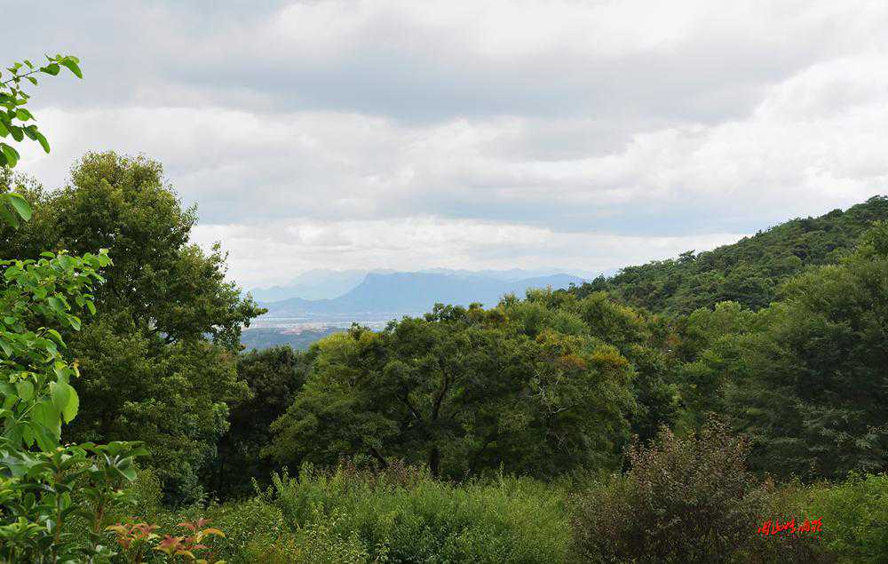 桃岩洞前行远眺,透过密密的松林可望见闽江。