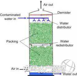 填充塔源自工业上气液交换应用。圆柱体塔身竖立放置,里面填充着高比表面积的填料。水自上而下,空气或氧气自下而上注入,利用填料的分散特性提高了气液交换面积。
