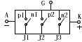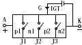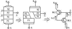 不管可控硅的外形如何,它们的管芯都是由P型硅和N型硅组成的四层P1N1P2N2结构。见图1。它有三个PN结(J1、J2、J3),从J1结构的P1层引出阳极A,从N2层引出阴级K,从P2层引出控制极G,所以它是一种四层三端的半导体器件。