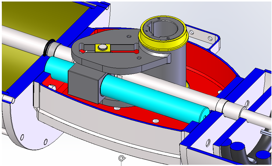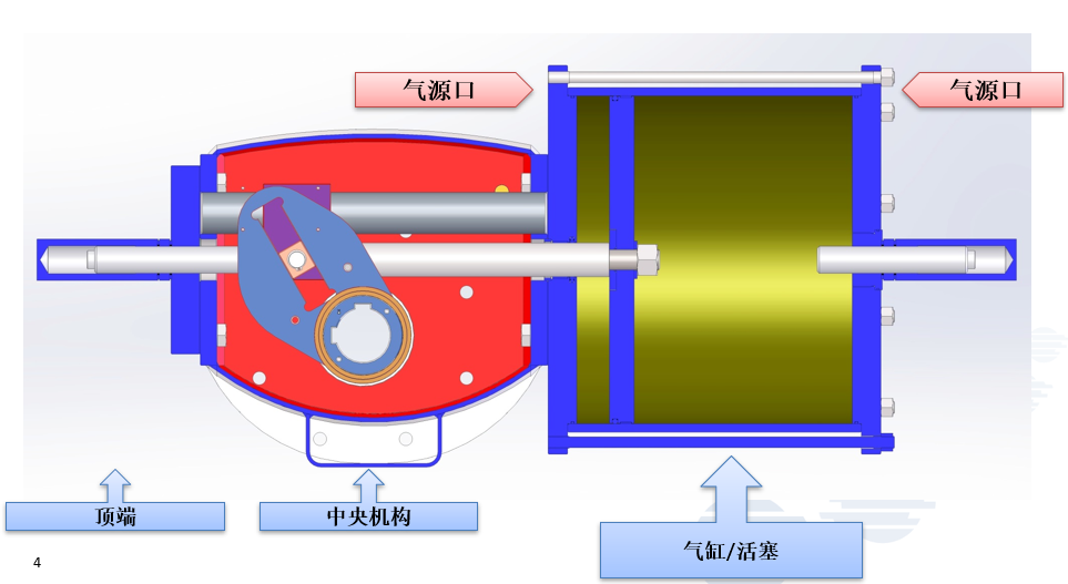 6.缸体内表面及拨叉(红色部分)具有防腐蚀作用。中央机构的防护等级为IP67,中央机构的上盖允许在执行器不从阀门处拆卸的情况下打开,进行检查及维护。