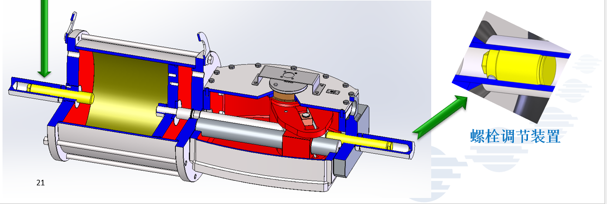8.总的运行角度100°(-5°+95°),调节螺栓可在执行器打开或关闭的位置上进行±5°的调节,而且不管是双作用还是单作用,调节螺栓都有保护帽,确保功能的完整性。