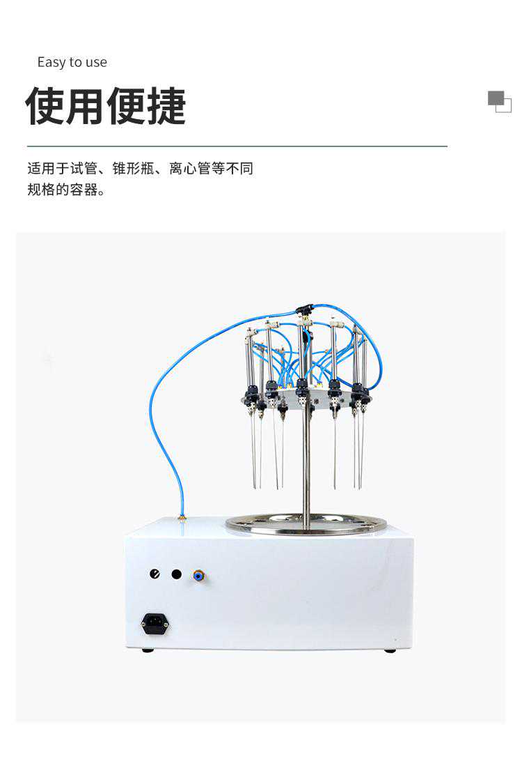 打开氮气瓶,调节流量计为氮吹仪送气;氮气只需开一点点,否则压力过大会把管路冲开,调节流量计至所需压力;