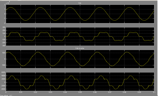 上图第一二项为高压35KV侧的电压及电流波形,第三四项为低压侧的电压电流波形,从图中可以看出,因中频电源工作时产生的谐波电流注入上端系统,造成电网高低压侧的电流波形畸变较严重。